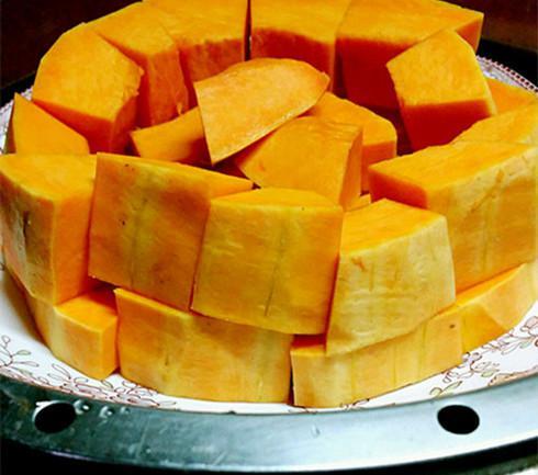 3. 切瓜:将南瓜切成薄片,厚度大约在0.5厘米左右,这样蒸的时间会更短。